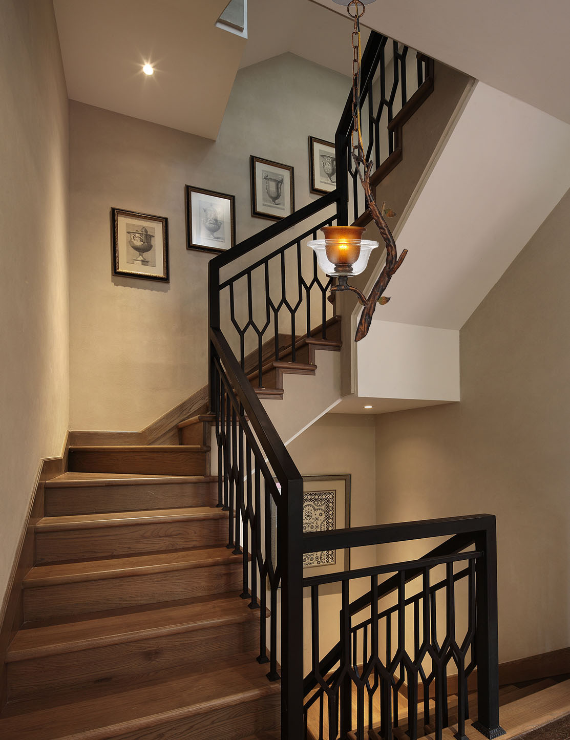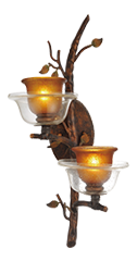 This rustic collection pays homege to nature's unrivaled beauty.Steel,hang formed "tree branches",grow upwards and around hand blown art glass.The swirled deep glden hues of the art glass evoke the changing colors of fall in the hills of vermont.